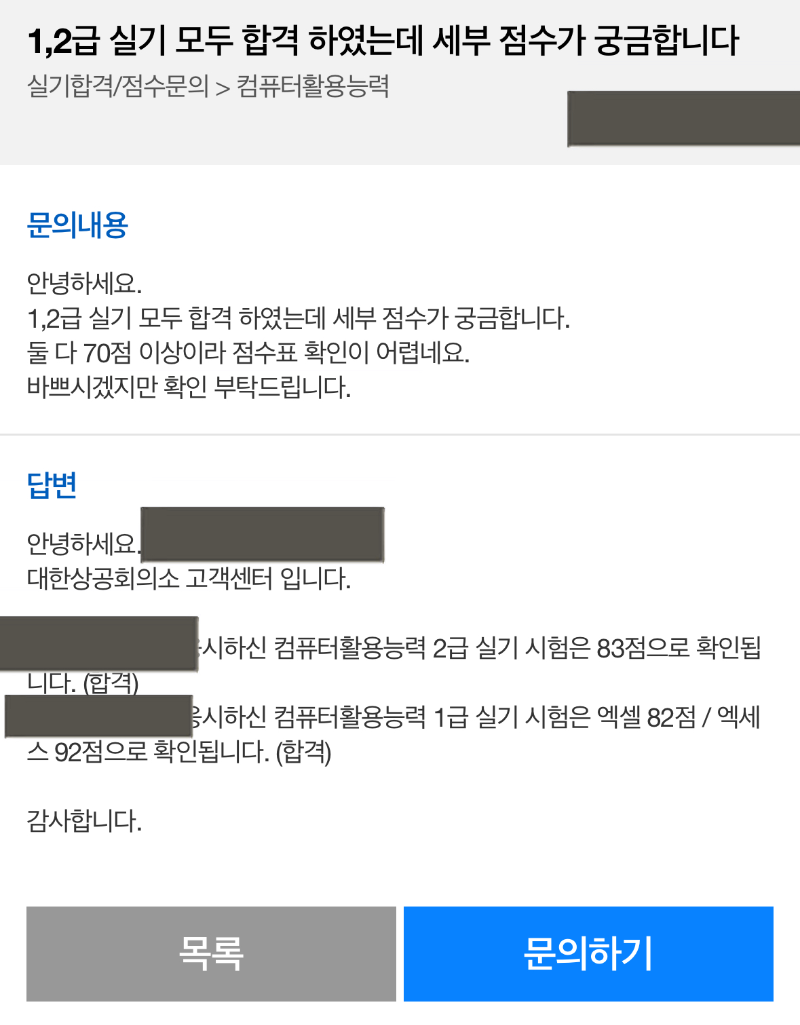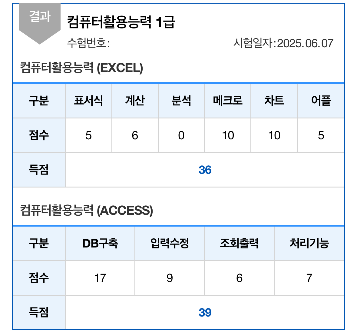 2급 시험 결과에는 <합격>딱지 붙어 있는데