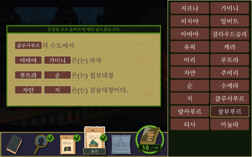 39개 다 모으면 이제 하단에 있는 메뉴들을 모두 클릭해서 단어 맞추기.......